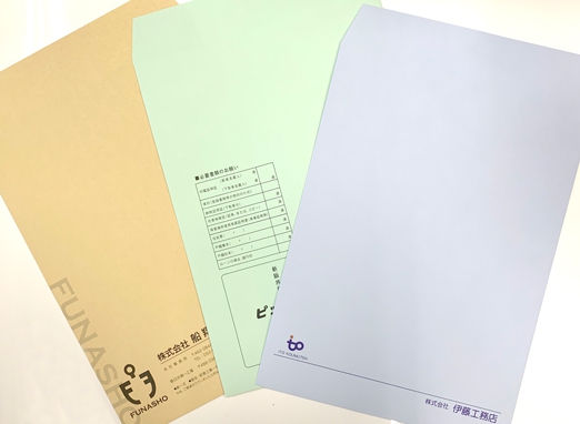 オリジナルデザインで他社との差別化を図ってください。印刷色は1色(特色)~フルカラーまで対応します。用紙も一般用紙の他、特殊紙でも対応可能ですので、お客様の要望に沿ったオリジナル封筒が作成可能です。サイズは長3/洋長3/角2の3サイズがあります。