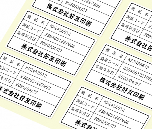 シール/ステッカー印刷 管理ラベル 備品や機材などの区別や管理に役立つシールです。 筆記用具で書き込むことが出来るシール素材なので、 品番や名称を書き込んで管理することが出来ます。 社名やロゴを入れたり、項目名を自由にデザイン可能です。 PREV LIST ≫ 業界別印刷セット≫ パンフレット印刷≫ リーフレット印刷≫ チラシ印刷≫ ポスター印刷 ≫ DMハガキ印刷≫ 名刺印刷≫ カード印刷≫ 封筒印刷≫ 伝票印刷 ≫ シール/ステッカー印刷≫ のぼり≫ 横断幕・懸垂幕≫ 活版印刷≫ オンデマンド印刷 ≫ ノベルティ≫ オプション加工≫ カレンダー印刷≫ 看板出力≫ 病院・医療広告